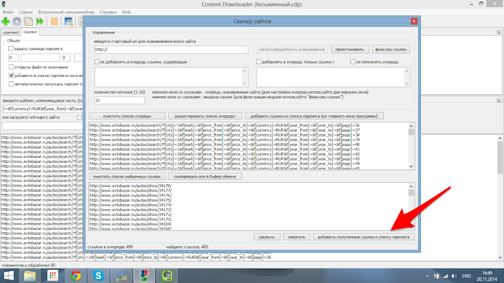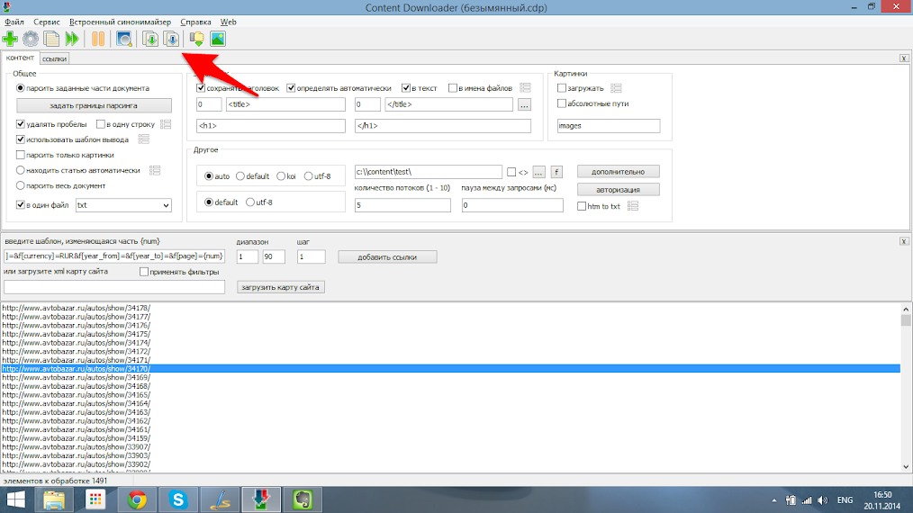 Открываем ContentDownloader и копируем найденный адрес сайта в поле указанное ниже, предварительно заменив номер страницы на такой параметр {num} в итоге у нас выйдет следующая ссылка http://www.avtobazar.ru/autos/search/?f[city]=1&f[mark]=&f[price_from]=