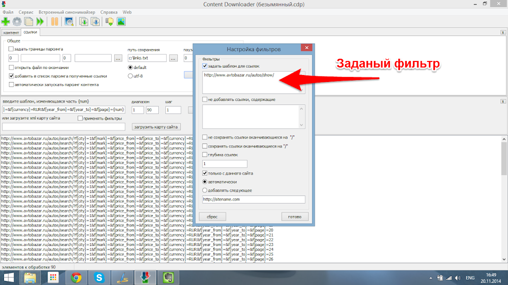 В открывшемся текстовом документы видно все ссылки на странице поиска, страницы каждого автомобиля имеют вид http://www.avtobazar.ru/autos/show/34177/ . В данном случае уникальной особенностью для страниц является часть http://www.avtobazar.ru/autos/show/ . Копируем его и добавляем в фильтр, указав отбирать только ссылки с этой частью.