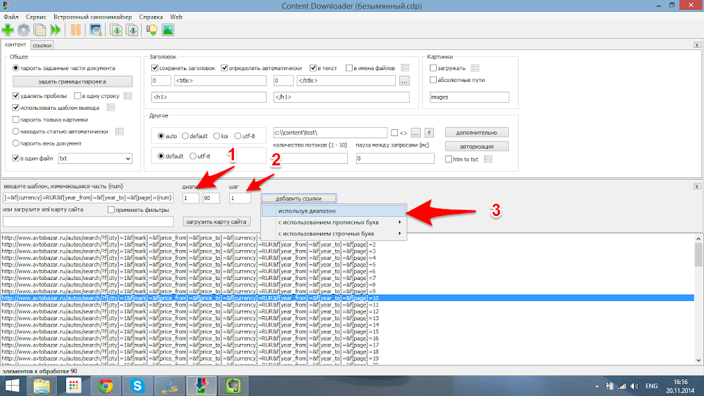 Задаем какой диапазон страниц мы будем использовать задав начальную, первую страницу(1) и последнюю страницу (90) в соответствующие поля. Шаг изменения параметра num указываем 1. В некоторых случаях номера страниц изменяются более чем на единицу, к примеру номер страниц могут быть следующие 0-5-10-15 и т.д., в таком случае шаг будет равен пяти. После чего добавляем к списку весь заданный диапазон. В итоге в нижней части экрана добавятся все ссылки на страницы из поиска.Шаг 4.