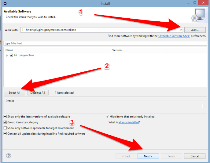 Открываем вашу среду разработки Eclipse. В нем необходимо добавить плагин для работы с эмулятором. Для этого нажимаем на пункт меню “Help” и выбираем подпункт “Install New Softawe”.В открывшемся окне нажимаем “Add” , после чего откроется окно, в котором необходимо указать путь к плагину, вводим следующий адрес http://plugins.genymotion.com/eclipse .