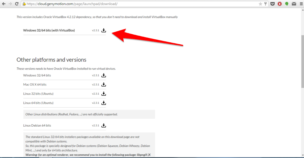 После регистрации качаем сам Genymotion перейдя на страницу загрузки или выбрав соответствующий пункт меню на сайте. Далее вбираем репозиторий для вашей операционной системы. Если у вас ранее не был установлен VirtulBox – не переживайте, он будет загружен и установлен вместе с эмулятором.
